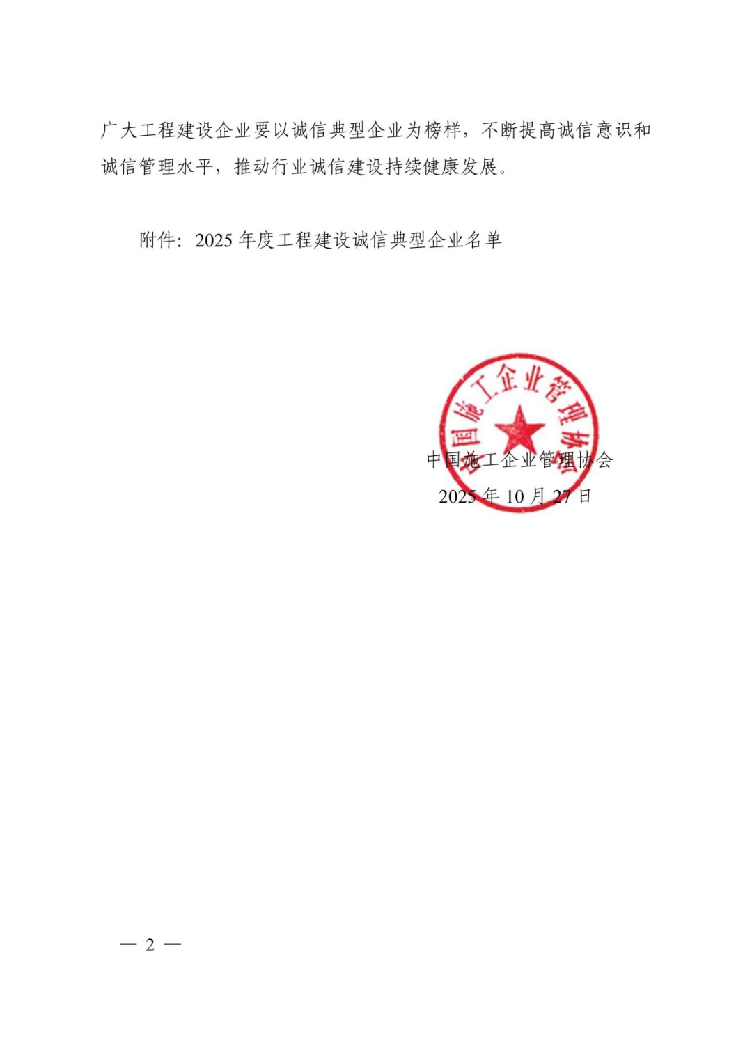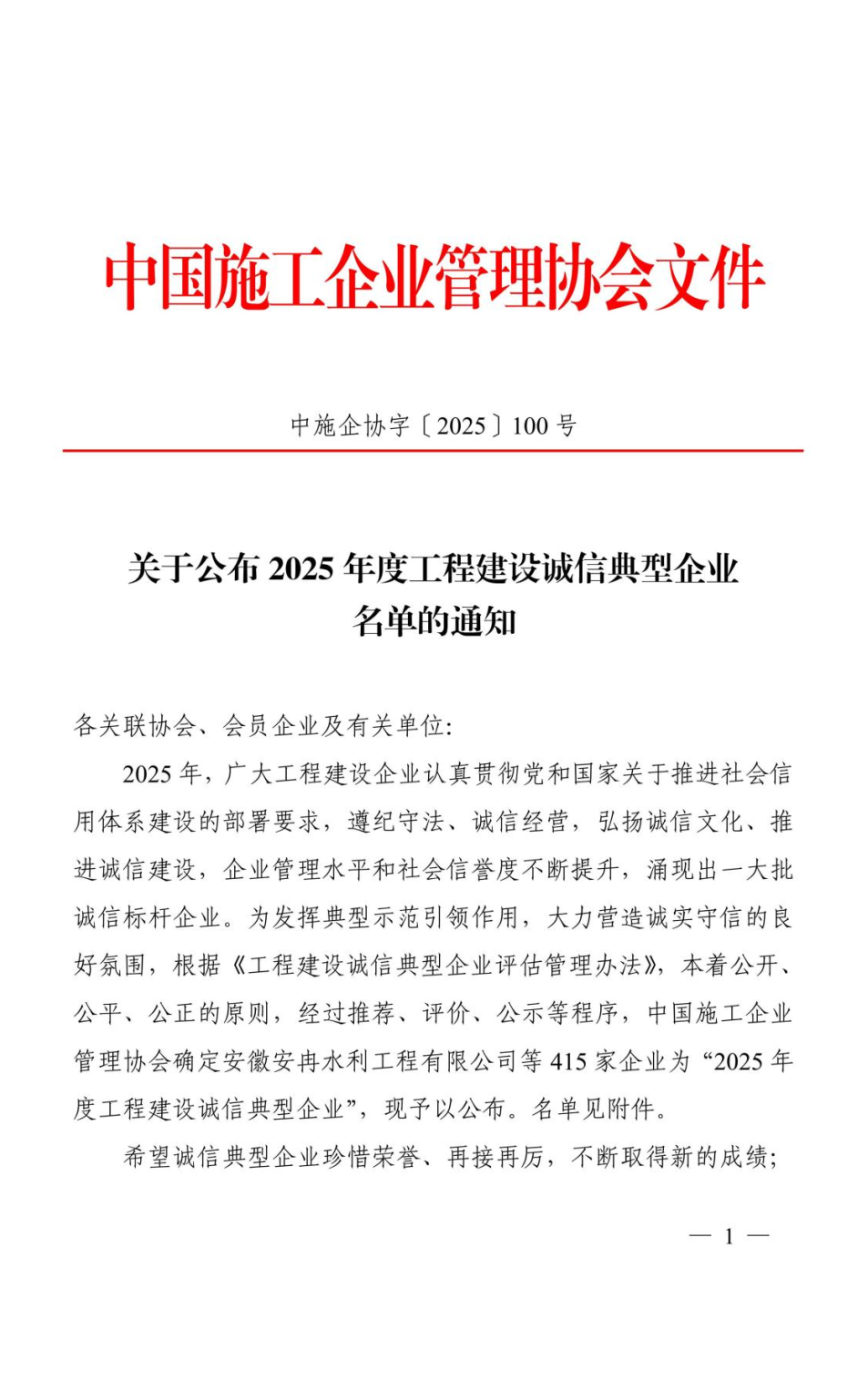 近日,中國施工企業管理協會正式發布《2025年度工程建設誠信典型企業名單》,湖北華夏水利水電股份有限公司憑借卓越的企業信譽、規范的經營管理與扎實的誠信建設成果,成功入選該名單,首次榮獲 “2025年度工程建設誠信典型企業” 榮譽稱號。